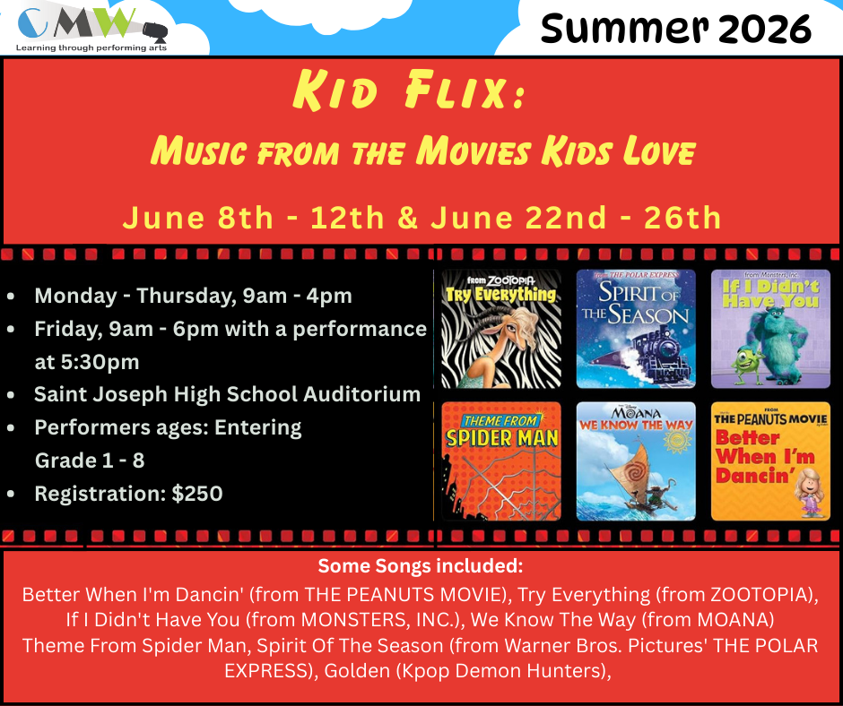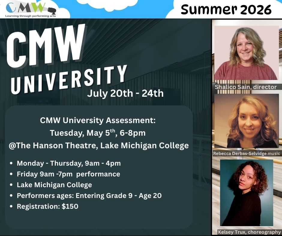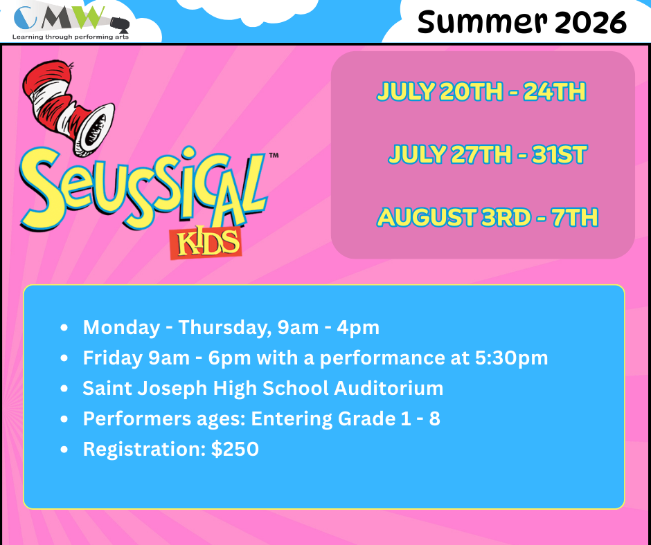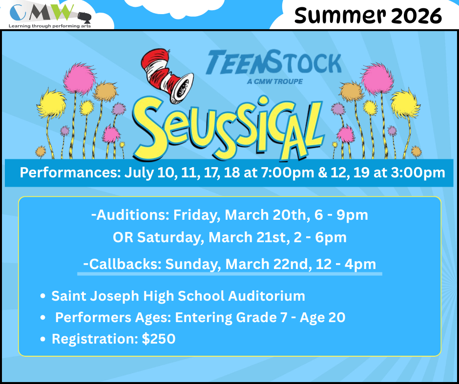 Performers entering Grades 7 through Age 20 are invited to audition for a part in CMW’s full-length production of Seussical! There is not a fee to audition, however if the performer is cast, the registration fee is $250*.
